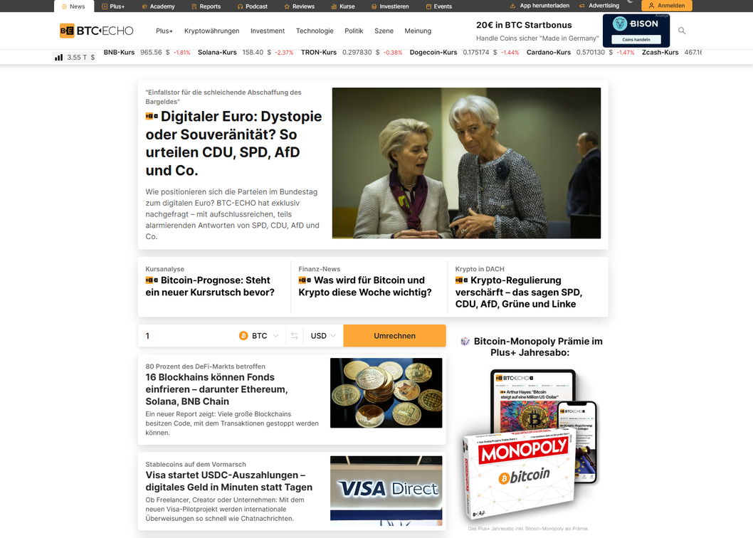 Btc-echo.de ist das reichweitenstärkste Portal für Bitcom, Blockchain und digitale Wahrnehmung und erreicht sowohl institutionelle als auch professionelle Privatanleger.